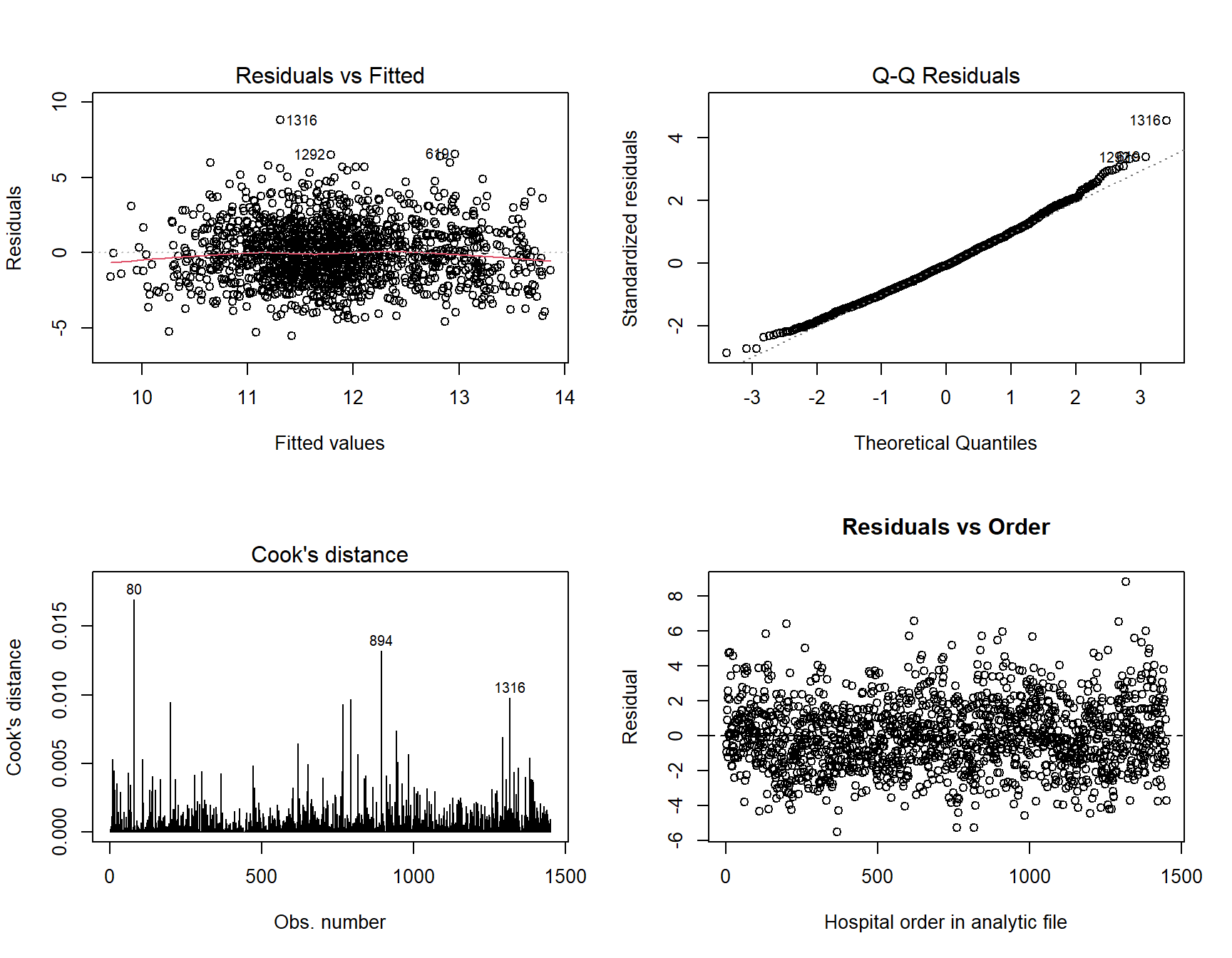- Tested a rural interaction to see whether the occupancy slope itself changes by hospital setting, then reviewed diagnostic outputs to check model behavior and outlier influence.