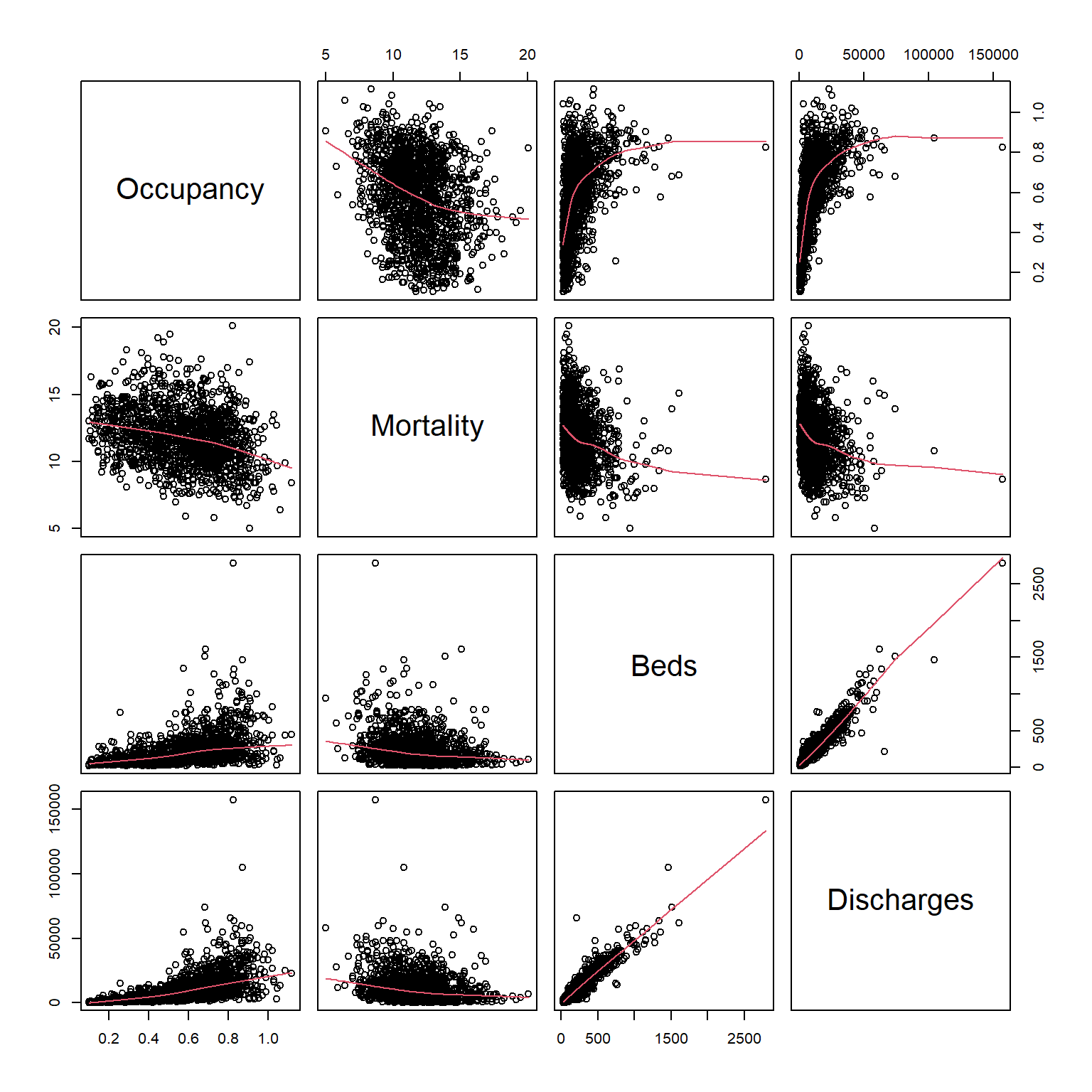 Variable structure. The exploratory view shows how occupancy, mortality, bed count, and discharges relate before formal modeling.