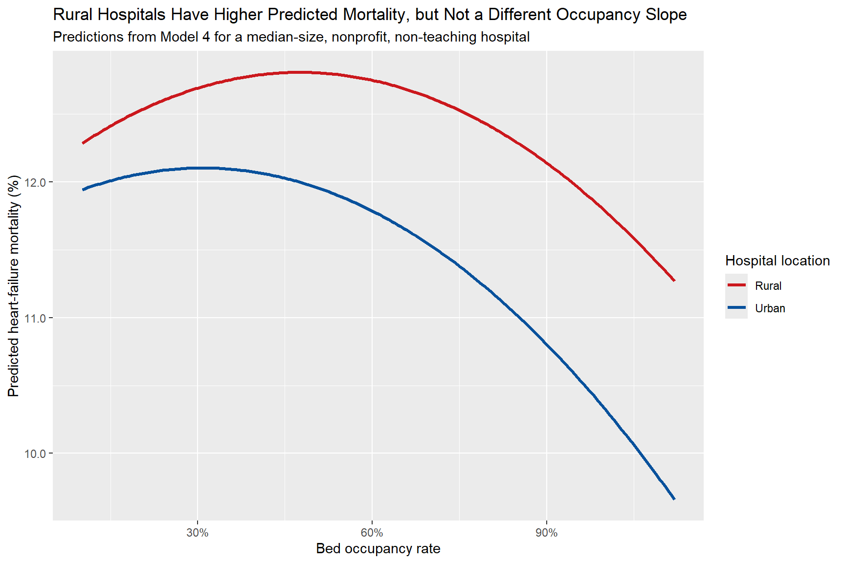 Rural versus urban prediction curves. Rural hospitals remain at a higher predicted mortality level, even though the occupancy slope itself is not meaningfully different.