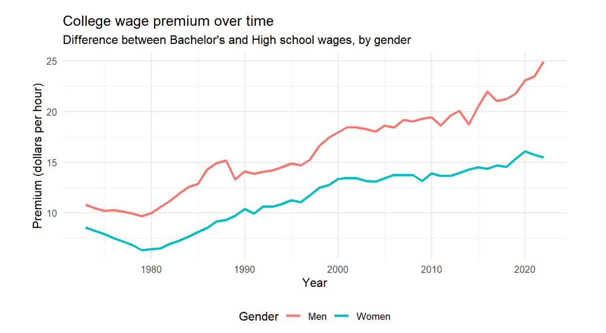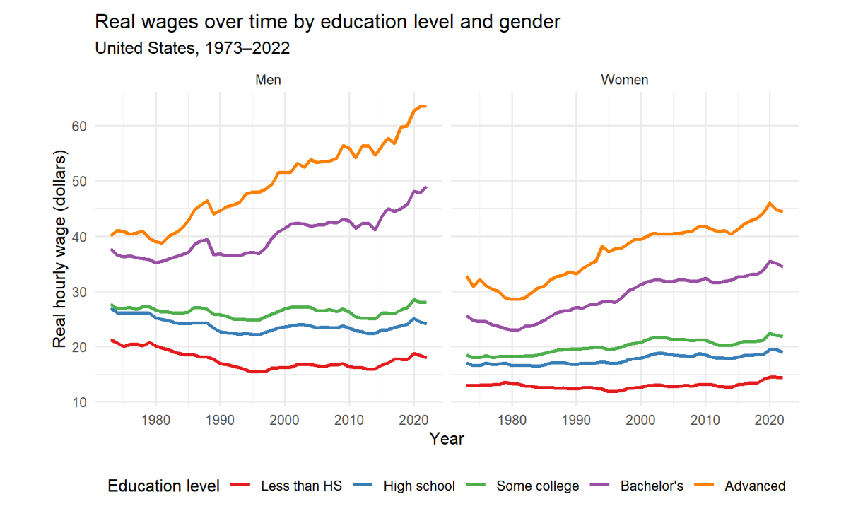 I created line charts showing wages from 1973 to 2022 for five education levels, separated by gender. The patterns are clear.