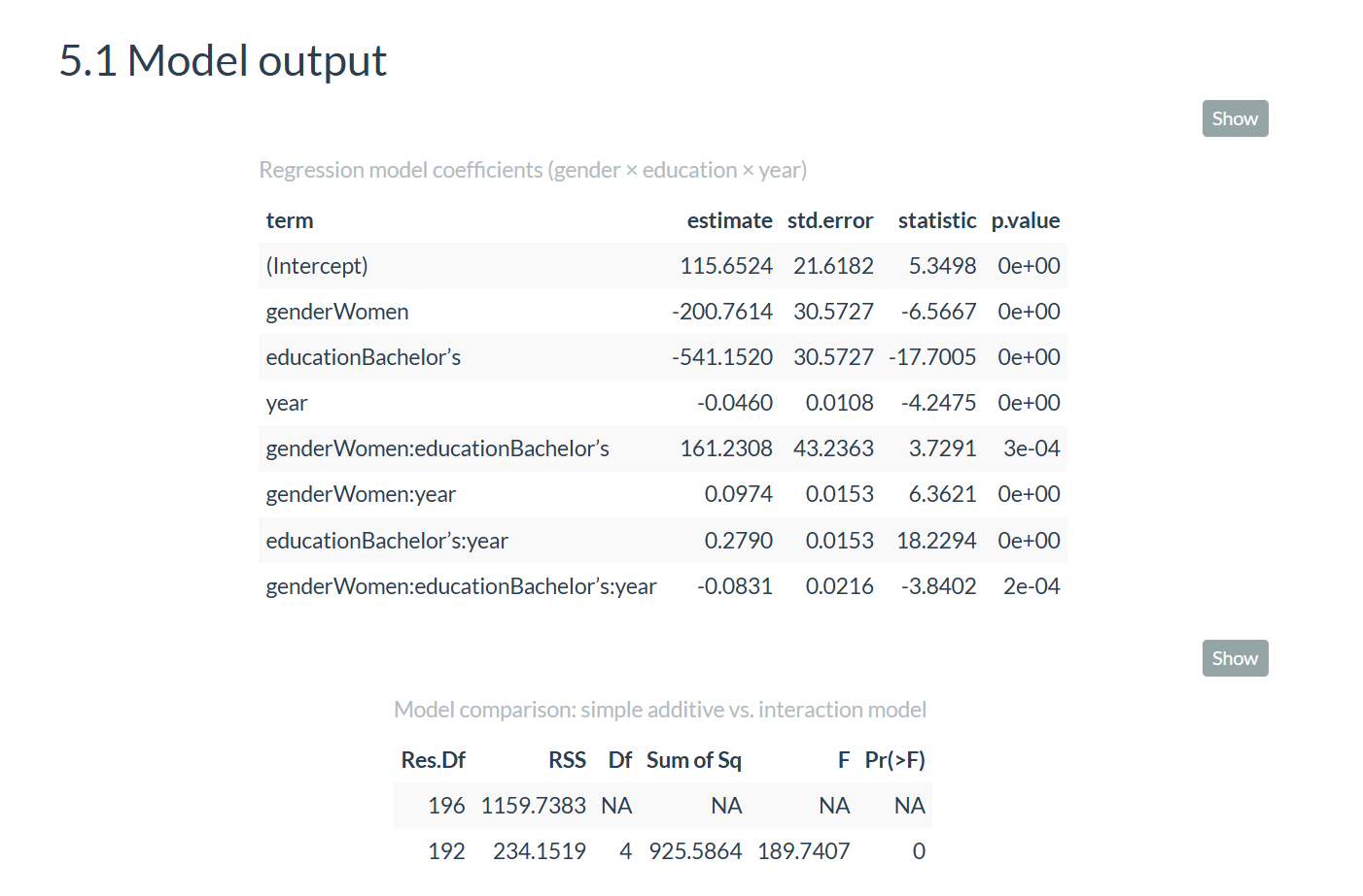 I used a regression model that includes interactions between gender, education, and year to capture how these factors move together.