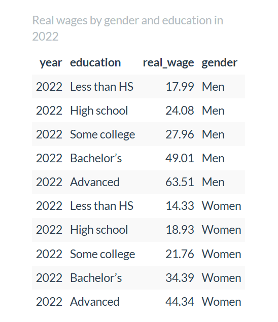In 2022, men with a bachelor degree earned about 49.01 dollars per hour. Men with only a high school diploma earned about 24.08 dollars per hour. Women follow the same structure with lower wages at every level.