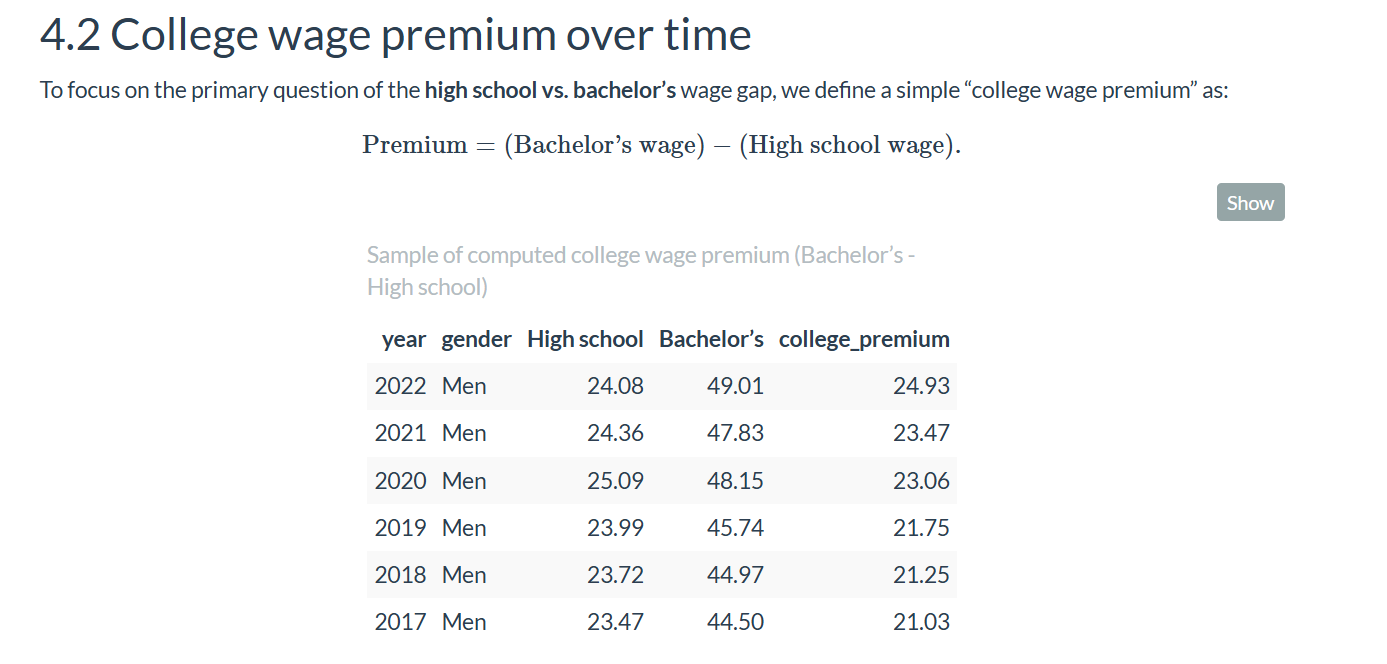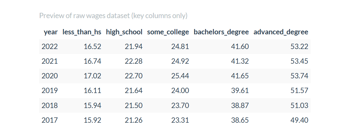 So I wanted to create a clear and honest analysis that shows how wages changed across fifty years. I wanted something that feels like a consulting report a policy team could actually use. Something that shows what education really buys people over time and how gender interacts with all of it.