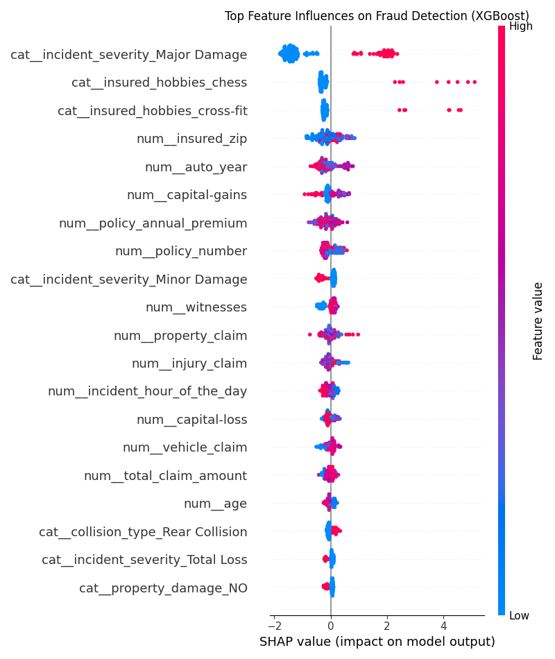 After training, I used SHAP (SHapley Additive exPlanations) to visualize how each feature influenced fraud predictions. The plot shows that claims labeled as -Major Damage- or -Total Loss- had the strongest positive impact on the model-s fraud likelihood. Interestingly, customer-level details like hobbies (e.g., chess or cross-fit) and policy premiums also appeared as strong differentiators, suggesting that lifestyle or policy value patterns may indirectly flag higher-risk cases.