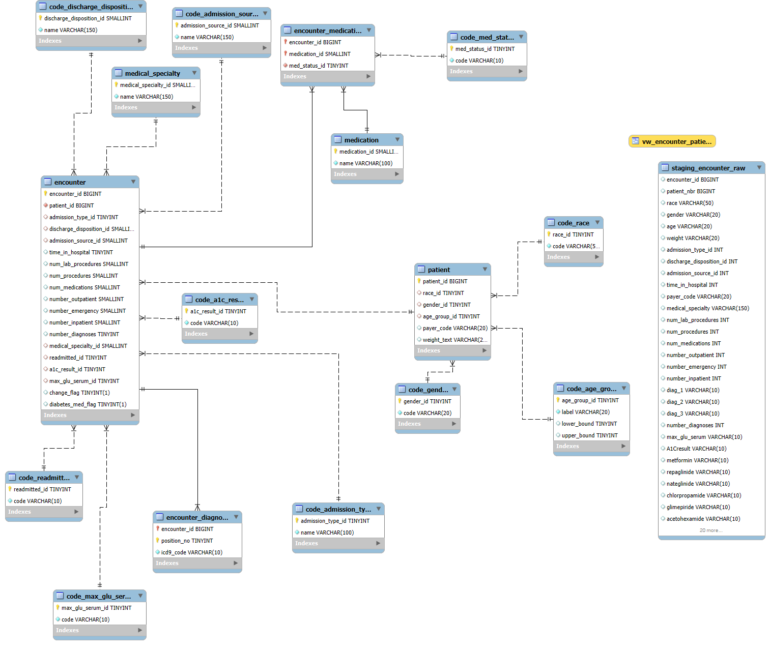 I built a normalized schema in MySQL to handle patients, encounters, diagnoses, and medications. A staging table pulled in the raw CSV, then I cleaned and mapped the categories (race, gender, readmission flags, A1C, glucose levels). From there I created a single analysis view that was easy to query later in R and Power BI.